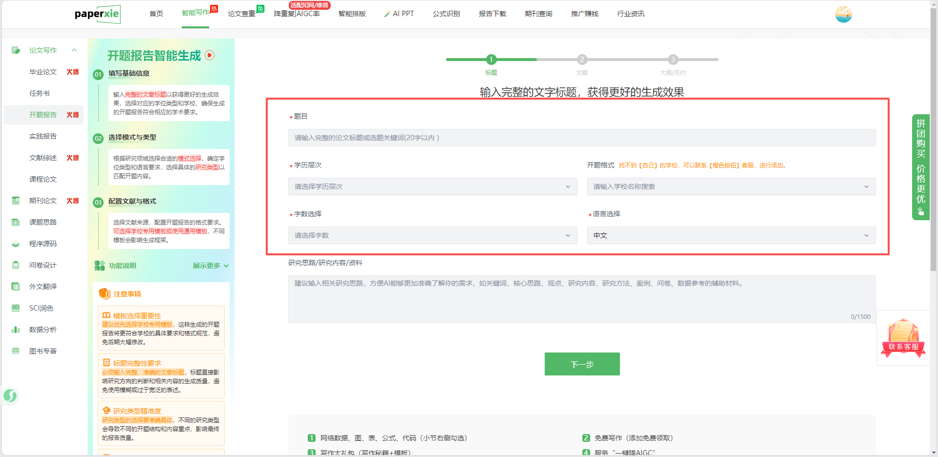 - 多模态支持:融入图表、公式等元素,适配理工科实验报告或社科调研类开题需求。