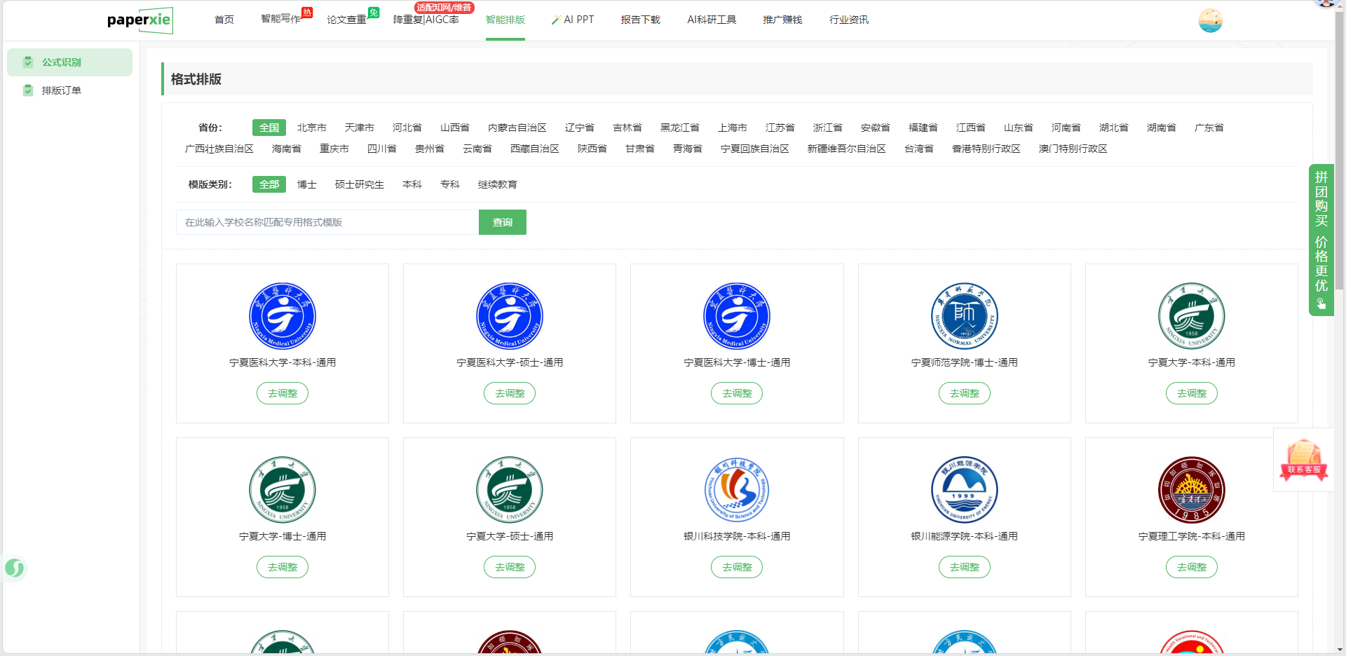 - 多维度筛选匹配:支持按省份、学历层次(博士、硕士、本科、专科)进行分层筛选,缩小模板匹配范围;同时提供院校名称检索功能,可直接匹配对应院校的专用排版模板,模板内容涵盖该校要求的页眉页脚设置、字体字号标准、目录生成规则、段落缩进等细节规范;