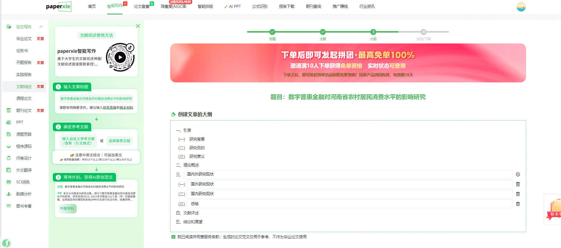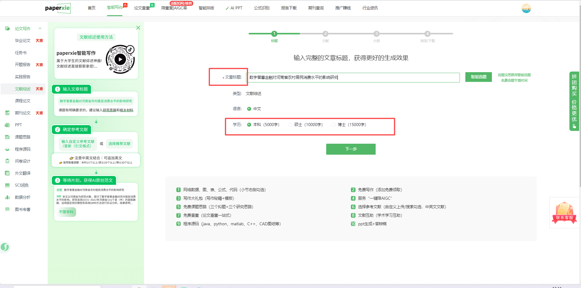 打开 paperxie 的 “文献综述” 功能模块,只需输入完整的文章标题(如 “数字普惠金融对河南省农村居民消费水平的影响研究”),并选择学历层次(本科 / 硕士 / 博士),平台会自动匹配该领域的研究深度与字数要求(本科 5000 字、硕士 10000 字、博士 15000 字)。这一步就像给 AI 划定了 “创作边界”,确保内容与你的学术阶段完全适配。