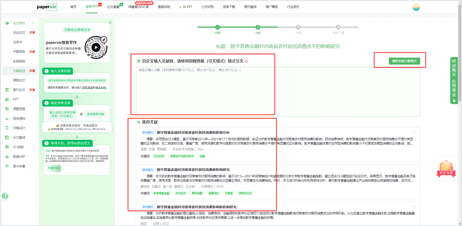 [1] 李鹏,方瑞,贾筱毓.数字普惠金融对河南省农村居民消费的影响分析[J].农业技术与装备,2023(02):45-48.),平台会自动校验格式,避免 “伪引用” 风险。 - 智能推荐:若你还未筛选文献,paperxie 会基于标题精准推送领域内核心文献(如上图中 “数字普惠金融对河南省农村居民消费” 的系列期刊),每篇文献都标注摘要、关键词、发表时间,帮你快速判断相关性。本科建议选 15 篇以上、硕士 20 篇以上、博士 30 篇以上,且支持中英文文献混合上传,兼顾国际视野。