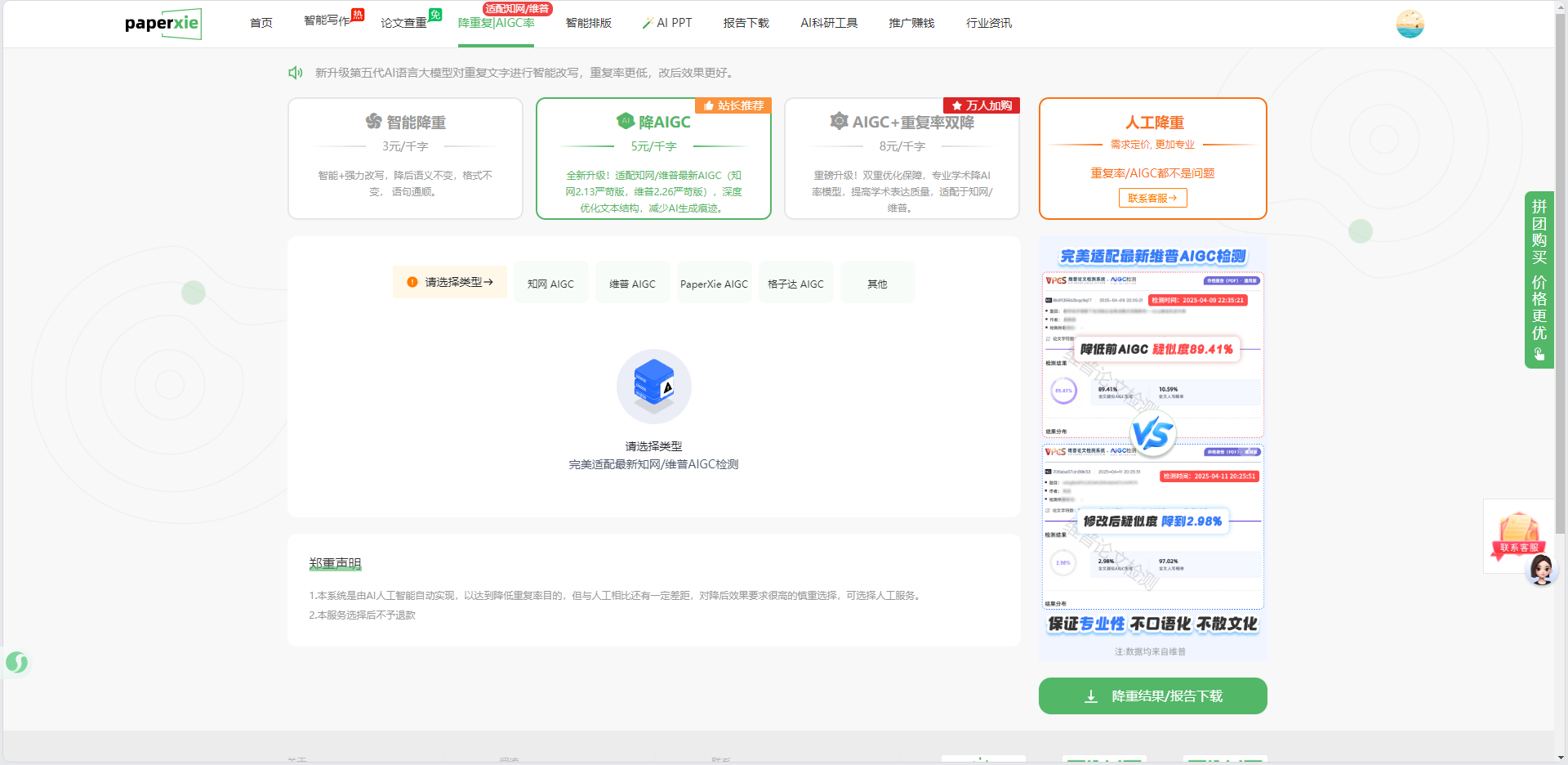 这个工具把这些 “痛点” 做成了 “学术化降重流水线”—— 从选检测类型到出结果,每一步都帮你对齐 “降重 + 保学术” 的双需求。