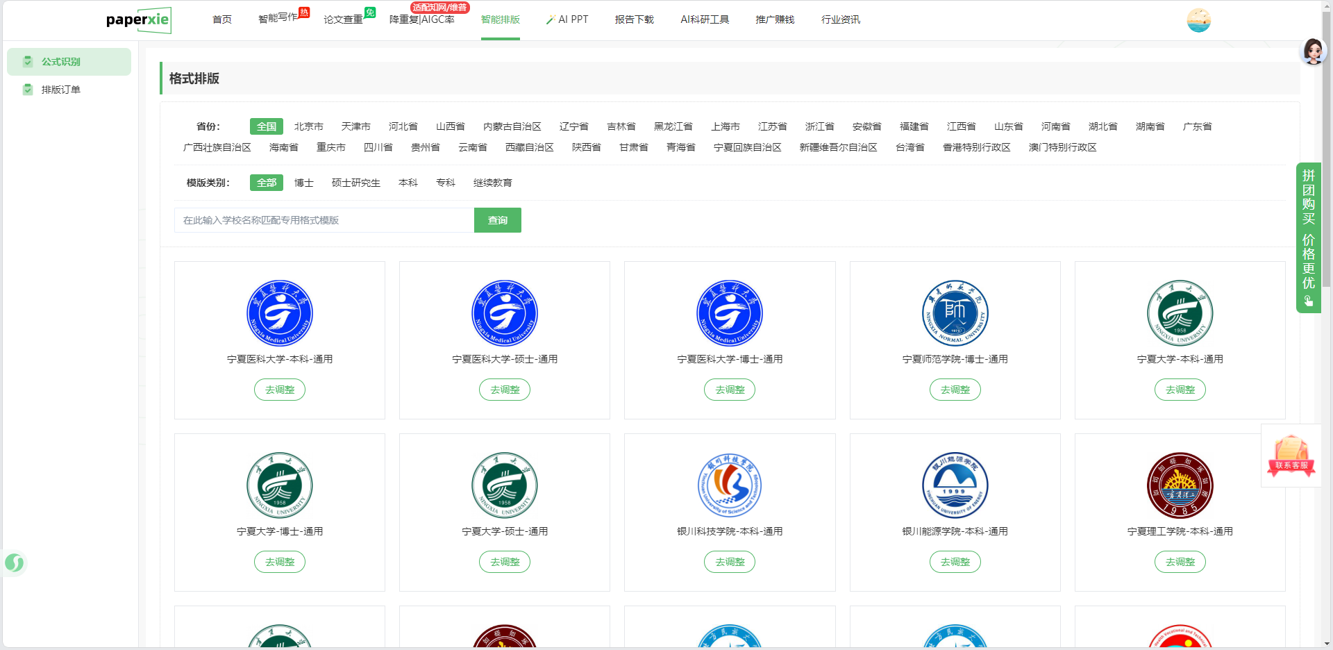 界面上直接分了 “省份→学校→学历” 三层筛选:比如你是 “北京市 XX 大学的硕士”,选完后系统会自动调出该校硕士论文的排版模板 —— 包含学校要求的页眉样式(比如左侧是校徽、右侧是论文标题)、页脚格式(比如页码居中 + 学校名称),甚至连 “摘要要空两格”“关键词之间用分号” 这种细节都预设好了。