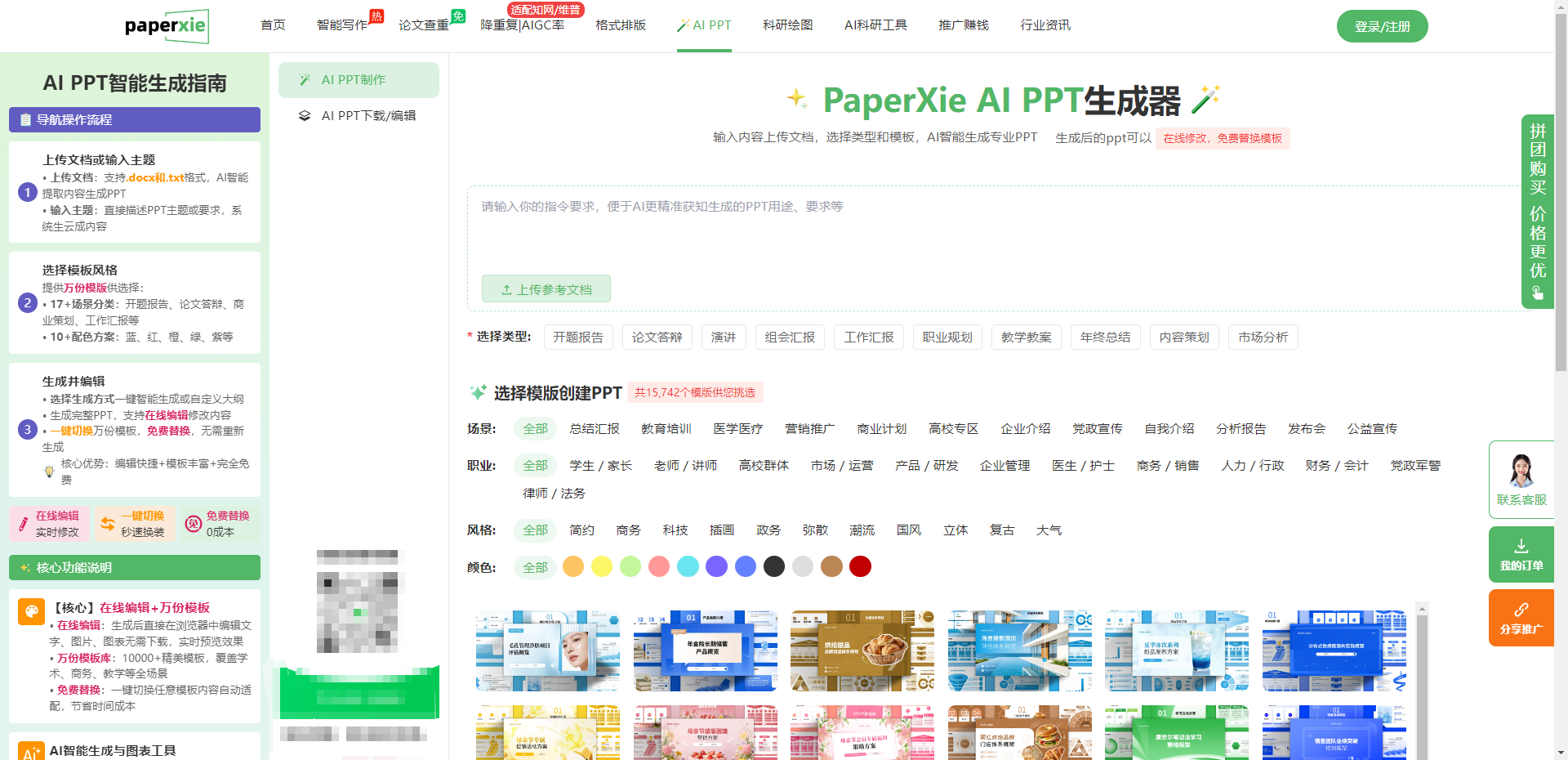 打开 Paperxie 的 AI PPT 生成页面,直观简洁的界面设计让人眼前一亮,完全没有复杂的操作门槛。左侧是清晰的功能导航,「AI PPT」选项醒目易找,点击后直接进入核心操作区。中间是分步骤的引导模块,从内容输入到模板选择,每一步都有明确的提示,哪怕是第一次使用的小白,也能跟着指引轻松操作。右侧的参数配置栏更是精准踩中答辩需求,支持选择 PPT 类型、场景、风格、配色,还有海量模板库实时预览,所有功能都围绕本科生答辩场景展开,真正做到了 “零学习成本,上手即会”。