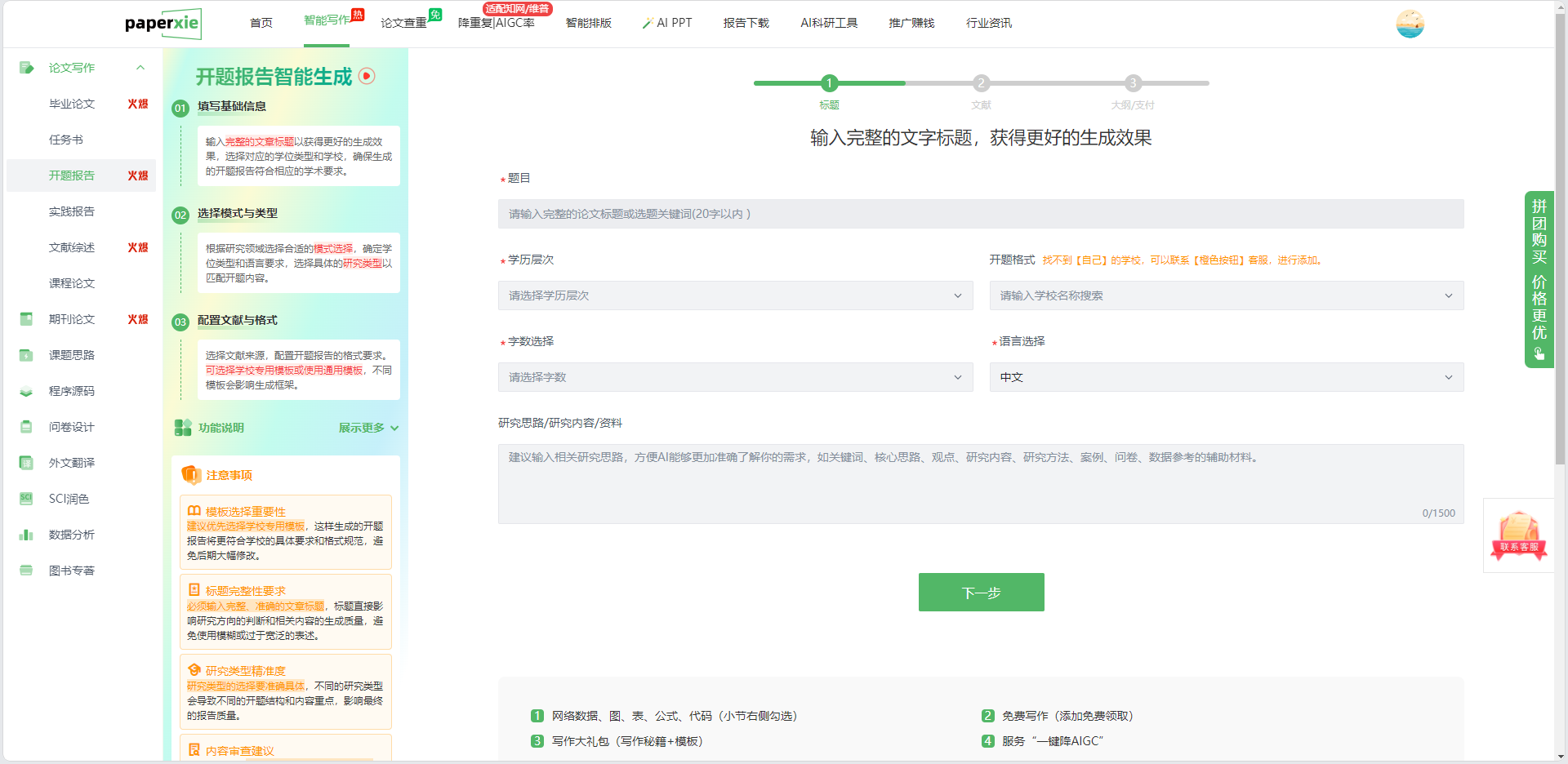 直到用了 PaperXie AI 写作里的开题报告工具,才发现 “想法→学术文稿” 能像 “搭积木” 一样自然:填个标题、选对学历,你的模糊思路会自动变成 “含研究缺口、方法、文献的答辩级报告”,连本校格式要求都能精准对齐。