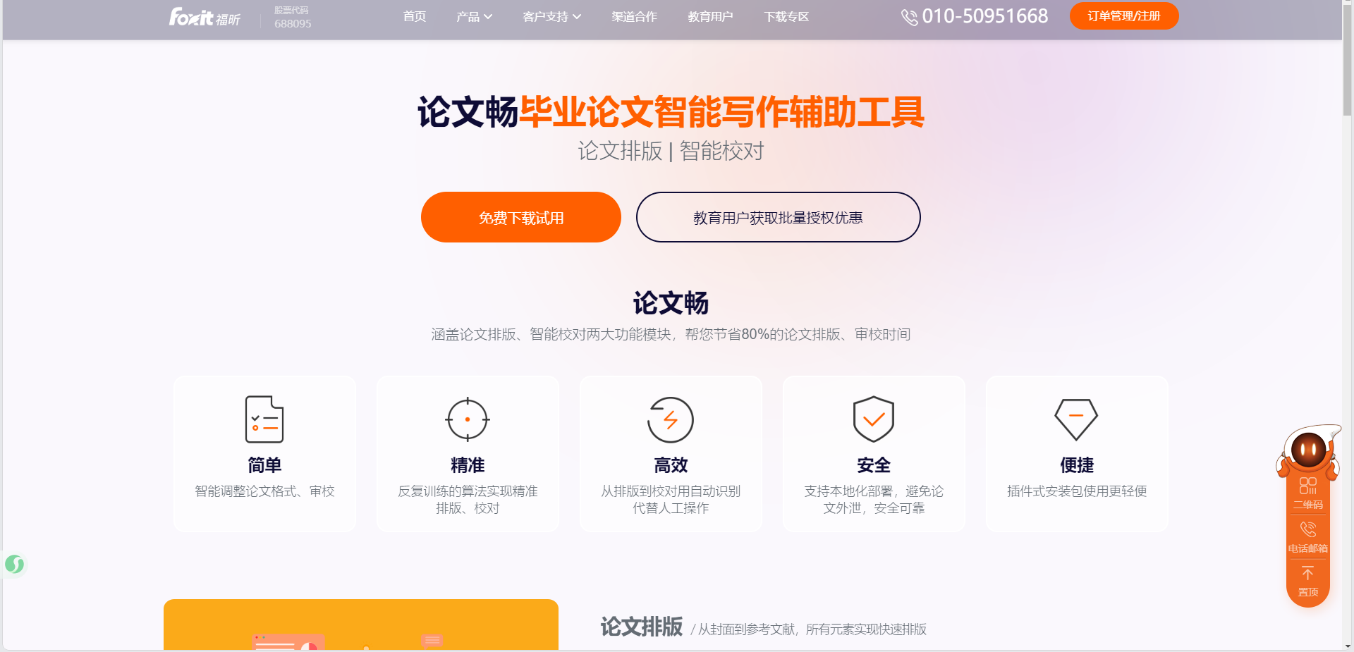 福昕论文畅涵盖了论文排版、智能校对、论文查重三大功能模块。可以根据学校的论文模板来创建、编辑论文,从封面一直到参考文献,所有元素都能快速进行排版。它拥有 20 余种论文排版、写作工具,只需鼠标点击,就能一键调整格式,帮助学生轻松调整论文格式,准确、快捷还不容易出错。