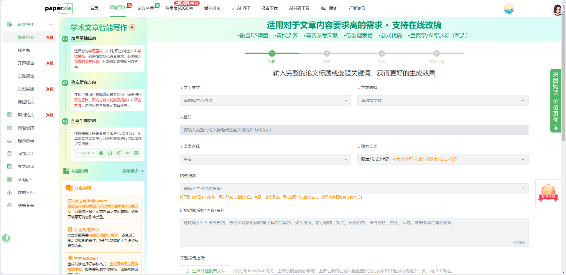 这一步相当于 “给论文定规矩”—— 比如选 “本科”+“某大学”,工具就知道要按 “15 篇文献 + 该校格式” 来生成。