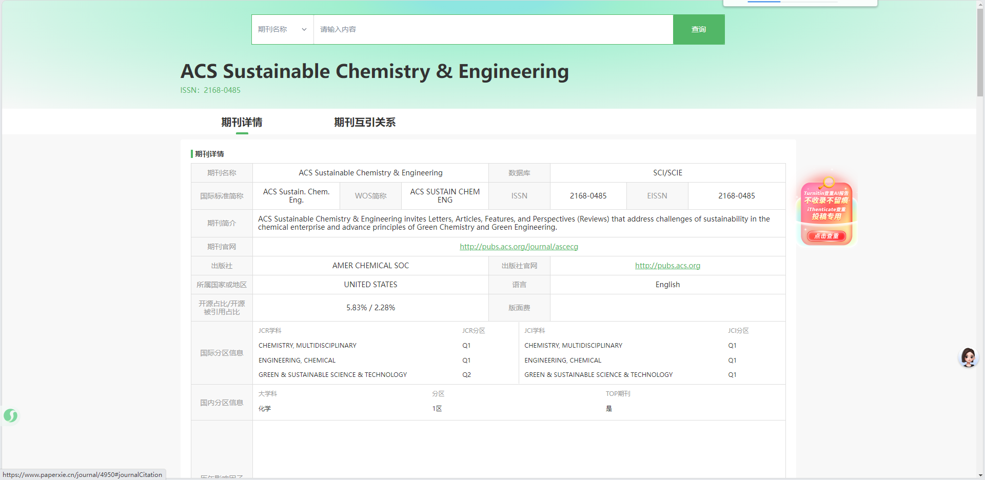 以ACS Sustainable Chemistry & Engineering为例,列表中直接显示它是 SCI 收录、影响因子 7.3、JCR Q1 区、国内 1 区,年发文 2119 篇 —— 这些信息足以帮你快速判断:“这本刊级别达标,收稿量也不小,值得尝试”。
