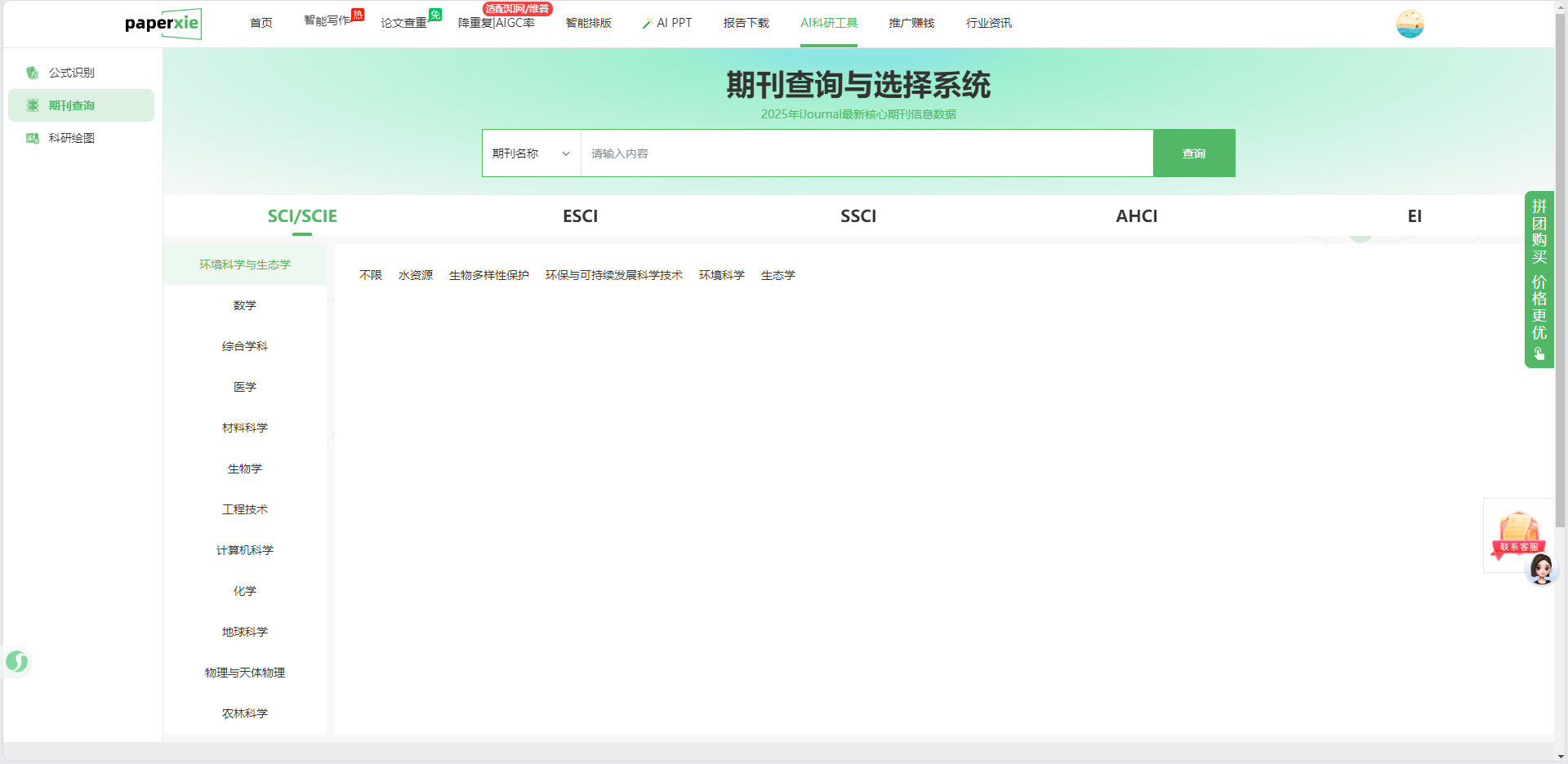 比如做环境领域 “水资源” 方向的研究,无需在海量期刊里碰运气:先选中 “环境科学与生态学” 一级学科,再点击 “水资源” 子主题,系统会直接筛选出该细分领域的期刊;若目标是 SCI 期刊,只需切换到顶部的 “SCI/SCIE” 标签,就能定向查看 SCI 收录的水资源相关刊。