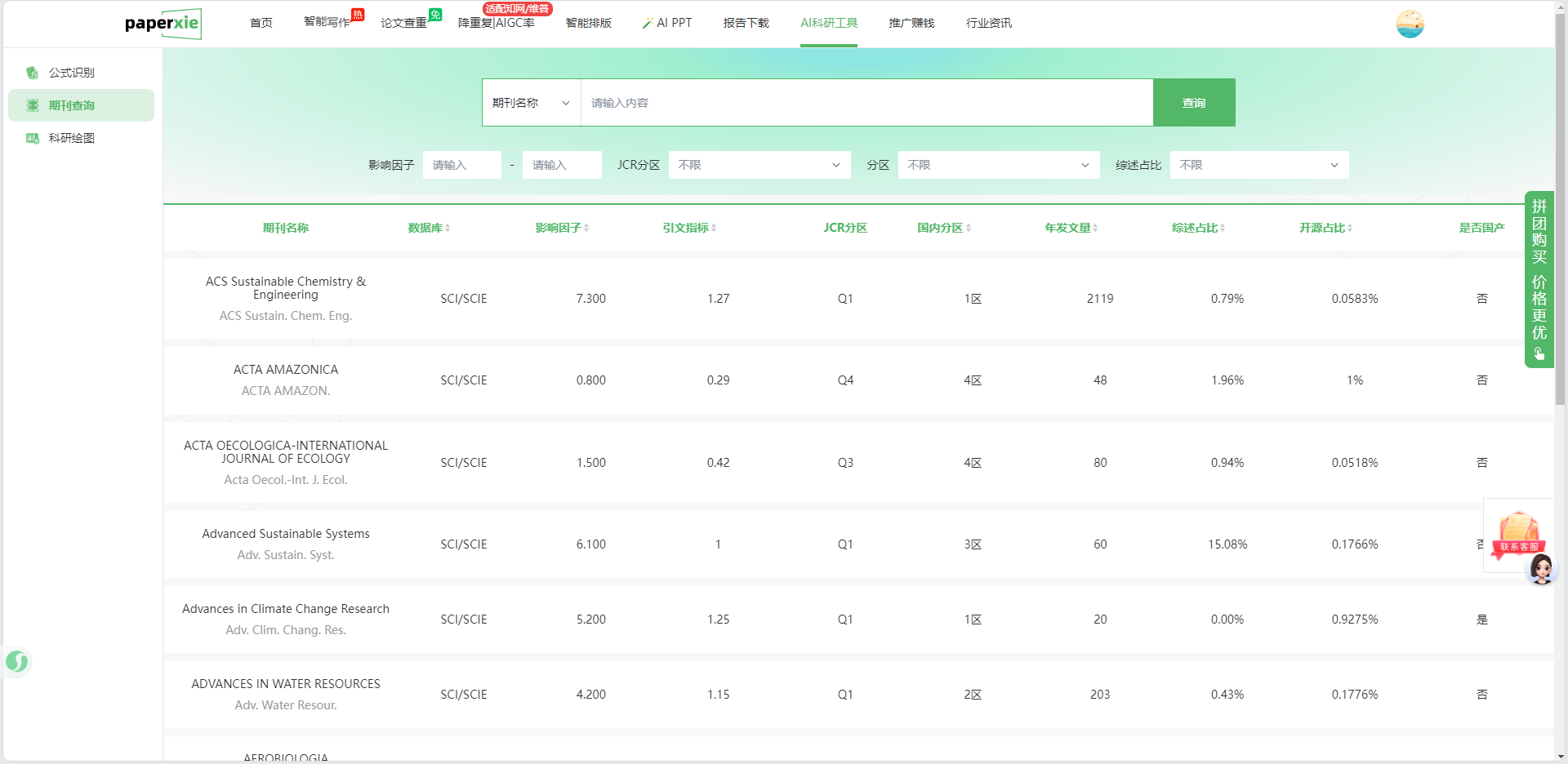 打开 PaperXie 的期刊查询系统,最直观的感受是 “分类足够精细”—— 左侧的学科列表覆盖了环境科学与生态学、数学、医学、计算机科学等数十个一级学科,每个学科下还拆分出更细分的研究主题。