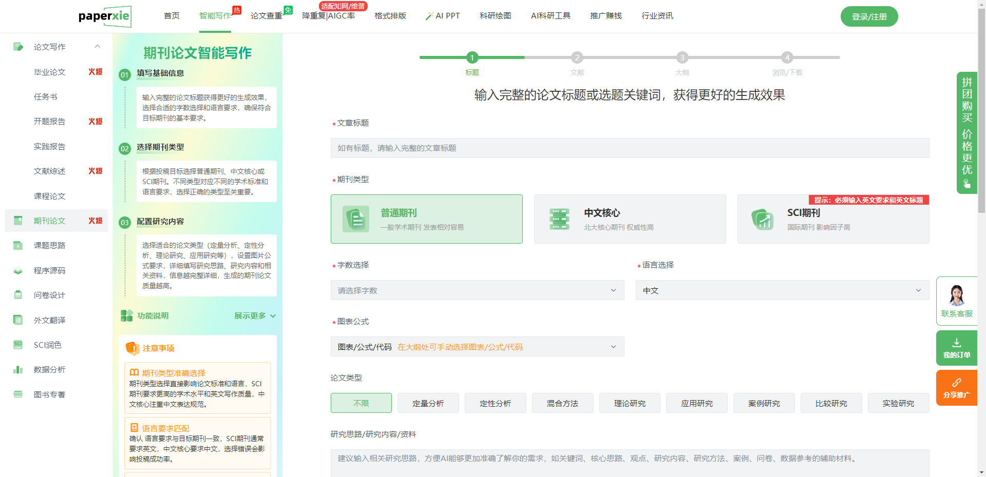 Paperxie 的 AI 期刊论文智能写作功能,彻底摒弃了传统 AI 写作 “泛泛生成、脱离期刊需求” 的弊端,以 “期刊类型精准匹配 + 研究类型定制化生成” 为核心,打造了一套标准化的四步创作流程,每一步都严格贴合期刊投稿的核心要求,从根源上解决投稿适配问题。第一步是填写基础信息,这是整个写作流程的 “定调环节”,平台明确提示 “输入完整的论文标题或选题关键词,获得更好的生成效果”,系统会基于用户输入的标题或关键词,精准解析研究方向,为后续的期刊匹配、内容生成打下坚实基础,避免生成内容偏离选题核心。第二步是选择期刊类型,这也是 Paperxie 最核心的优势之一,平台将期刊清晰划分为普通期刊、中文核心、SCI 期刊三大类,每一类都标注了明确的定位:普通期刊是 “一般学术期刊,发表相对容易”,适合初投稿、追求发表效率的用户;中文核心是 “北大核心期刊,权威性高”,面向需要核心成果、提升学术影响力的科研人员;SCI 期刊则专门标注 “必须输入英文要求和英文标题”,定位 “国际期刊,影响因子高”,适配需要发表国际期刊的用户,彻底解决了科研人 “选刊难” 的问题,无需花费大量时间调研期刊要求,只需根据自身研究成果和发表目标选择对应类型,系统就会基于该期刊的审稿标准、格式规范生成内容,从源头规避选刊错误的拒稿风险。第三步是配置研究内容,进入精细化定制环节,平台从字数、语言、论文类型、图表公式四个维度,为用户打造专属写作方案:字数选择支持按需调整篇幅,适配从短篇综述到长篇研究论文的不同需求;语言选择覆盖中文和英文,完美匹配中文期刊的中文写作和 SCI 期刊的英文写作需求,解决 SCI 投稿的语言难题;论文类型模块全面覆盖定量分析、定性分析、混合方法、理论研究、应用研究等主流研究类型,每个类型都对应专属的写作框架,用户只需选择对应类型,系统就会生成符合该类型逻辑的论文结构,再结合用户输入的研究思路填充核心内容,确保论文框架严谨、逻辑自洽;同时支持手动选择图表 / 公式 / 代码类型,适配不同学科的论文规范,避免格式硬伤。第四步是输入研究思路,这是 AI 生成原创内容的核心环节,平台提示用户补充关键词、核心观点、研究方法、案例数据等辅助材料,让 AI 精准理解用户的研究需求,生成的内容完全贴合自身研究实际,避免 “AI 生成内容与研究脱节” 的问题,同时严格遵循对应期刊的学术规范,确保内容原创合规。