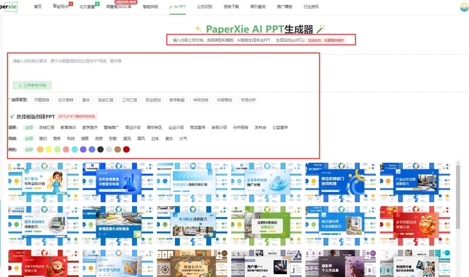在数字化办公与内容展示需求激增的当下,PPT 作为信息传递、方案展示、成果汇报的核心载体,其创作效率与专业度直接影响工作效能。PaperXie 凭借前沿 AI 技术打造的 AI PPT 生成器,打破传统 PPT 制作的效率瓶颈与设计门槛,为科研、职场、教育等多领域人群提供一站式智能创作解决方案。