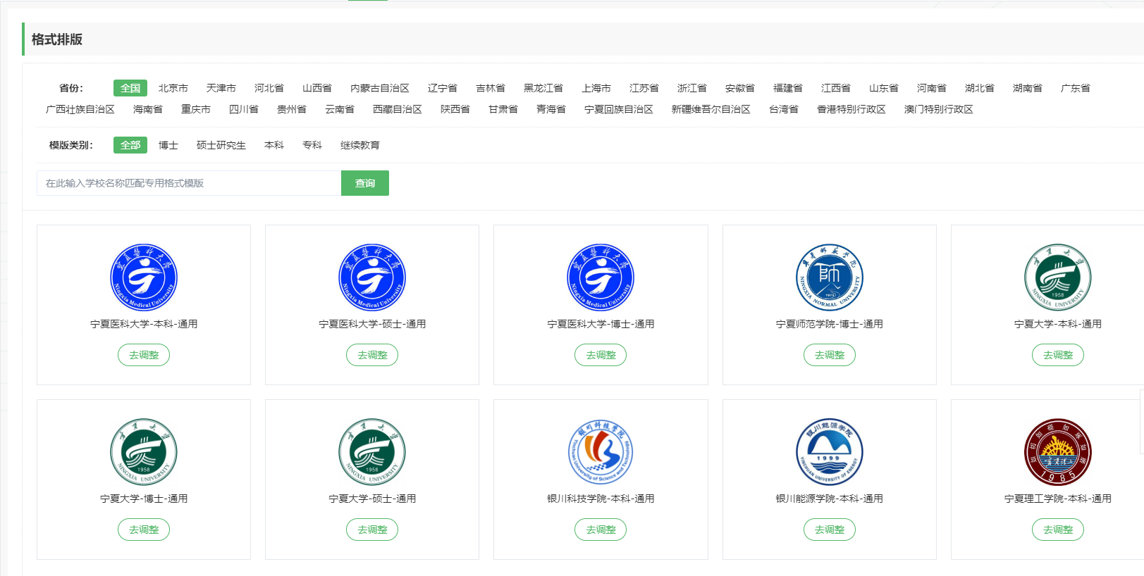 - 第一层:省份选择页面提供全国34个省级行政区(含自治区、直辖市、特别行政区)的快捷筛选按钮,如“北京市”、“上海市”、“广东省”、“宁夏回族自治区”等。用户可点击任意省份,系统将自动过滤出该省所有已收录的高校模板,极大缩小搜索范围,提升效率。