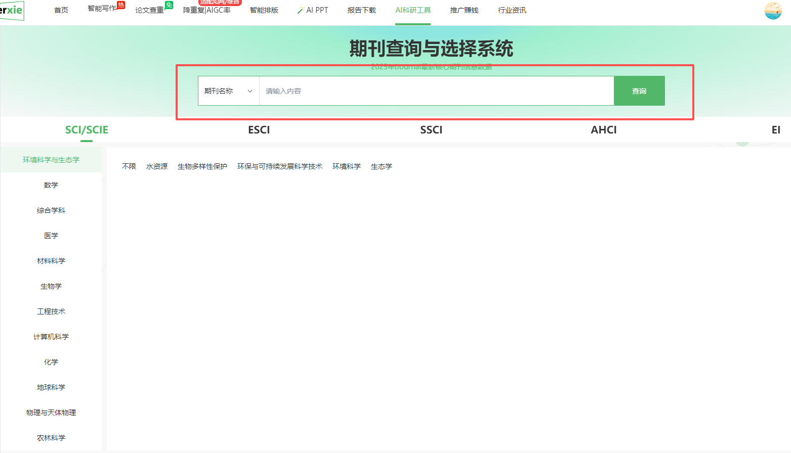 - 数据库分类:包含 SCI/SCIE、ESCI、SSCI、AHCI、EI 等主流学术数据库,可定向查询对应收录的期刊;